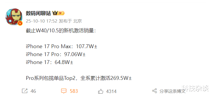 作为对比截止同样的日期iPhone 17系列的激活量已经达到269.5万台。其中iPhone 17 Pro Max的激活量为107.7万台,iPhone 17 Pro的激活量为97.06万台,iPhone 17的激活量为64.8万台。但是大家要明白iPhone 17系列比小米17系列早开售十多天的时间,也就是抢占了一波先机。现在无论是小米17系列还是iPhone 17系列都进入了平销期,接下来一周的数据才是最重要的。