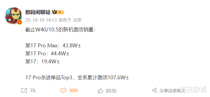 最新消息显示截止到10月5日小米17全系的激活量已经达到107.6万台,其中小米17 Pro Max的激活量为43.8万台,小米17 Pro的激活量为44.4万台,小米17的激活量为19.4万台。大家要知道小米17系列是9月27日正式开售的,也就是九天的时间激活量已经过100万台了。这已经是一个非常了不起的成就了,特别是这一次占销量大头的不再是标准版而是Pro系列。换言之定位越高、售价越高的机型越受市场欢迎。行业分析认为如果不是Pro Max版本缺货,小米17系列的销量还会再进一步。